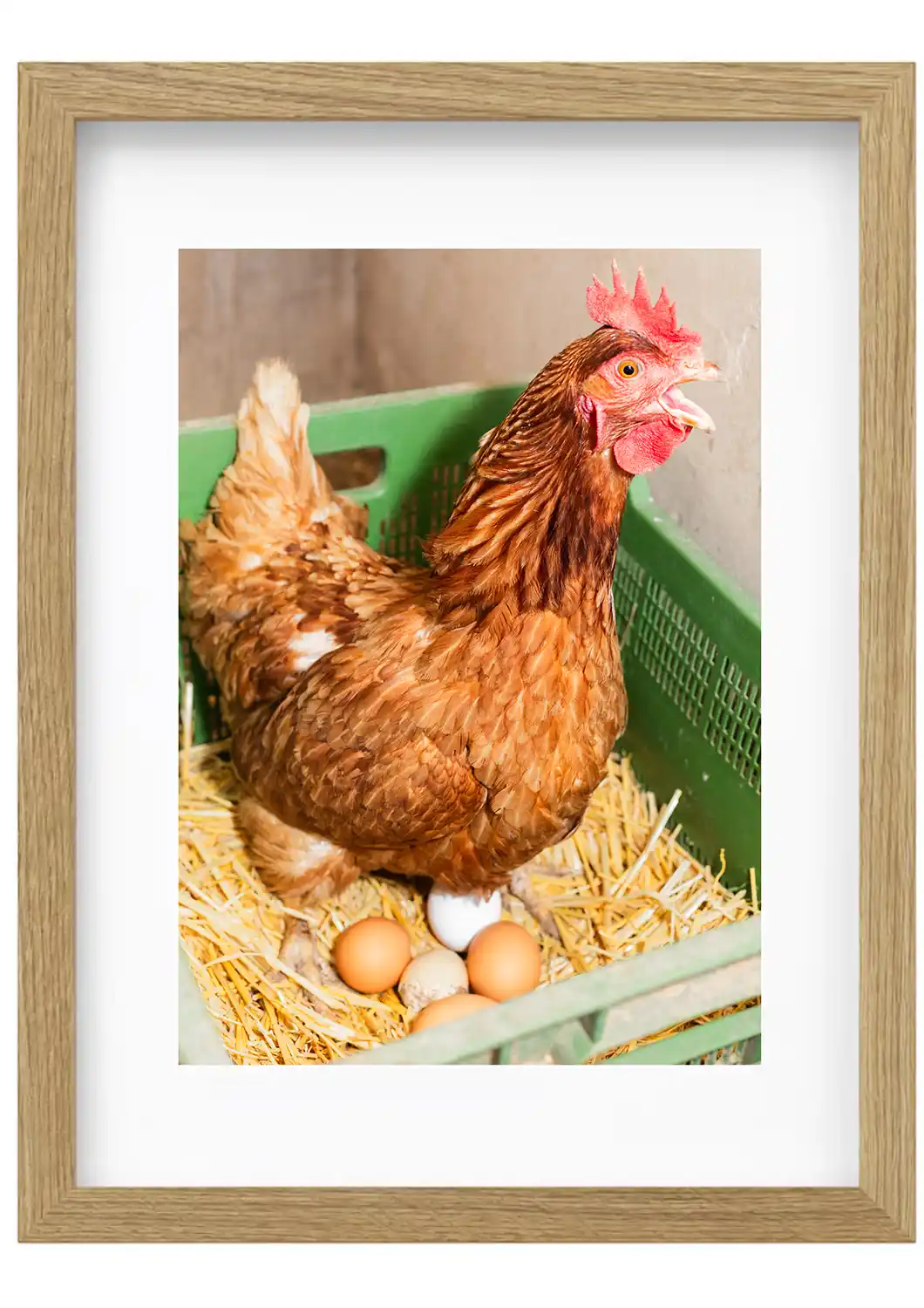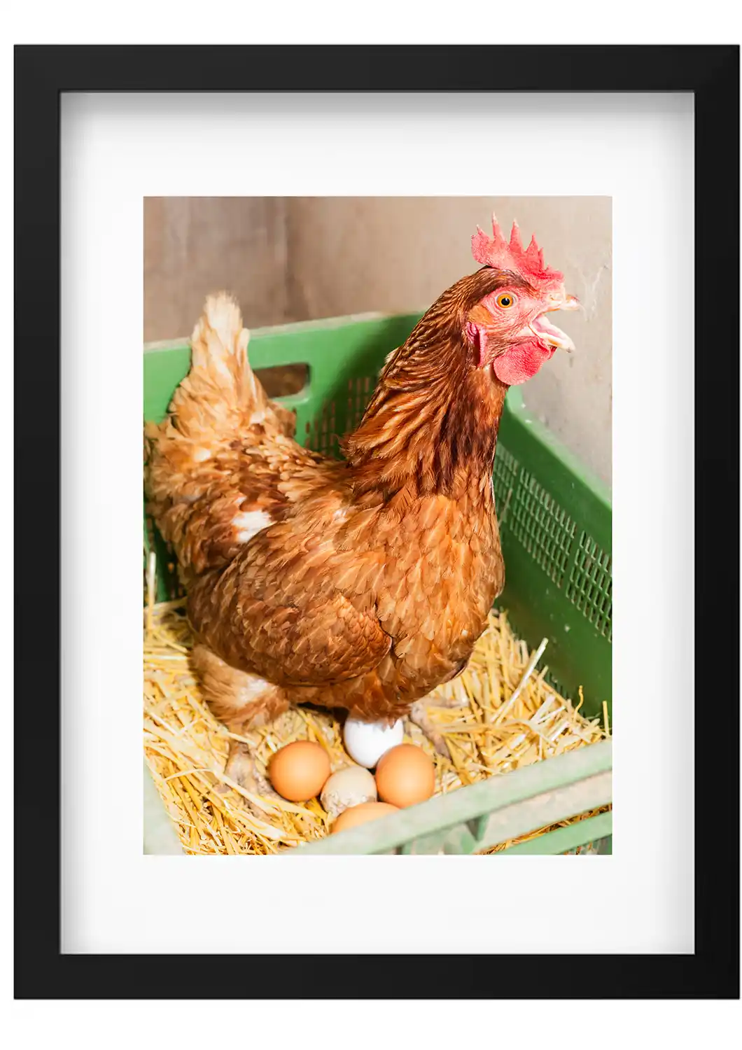 Gallina cacareando tras la puesta de un huevo en el nido. La acumulación de varios huevos en el mismo nido, es debido a la costumbre que las gallinas tienen en depositar todas sus huevos juntos. Como señal de cuál es el nido, se suele depositar un huevo falso, para que los animales tengan claro dónde se encuentra el nido en el gallinero.