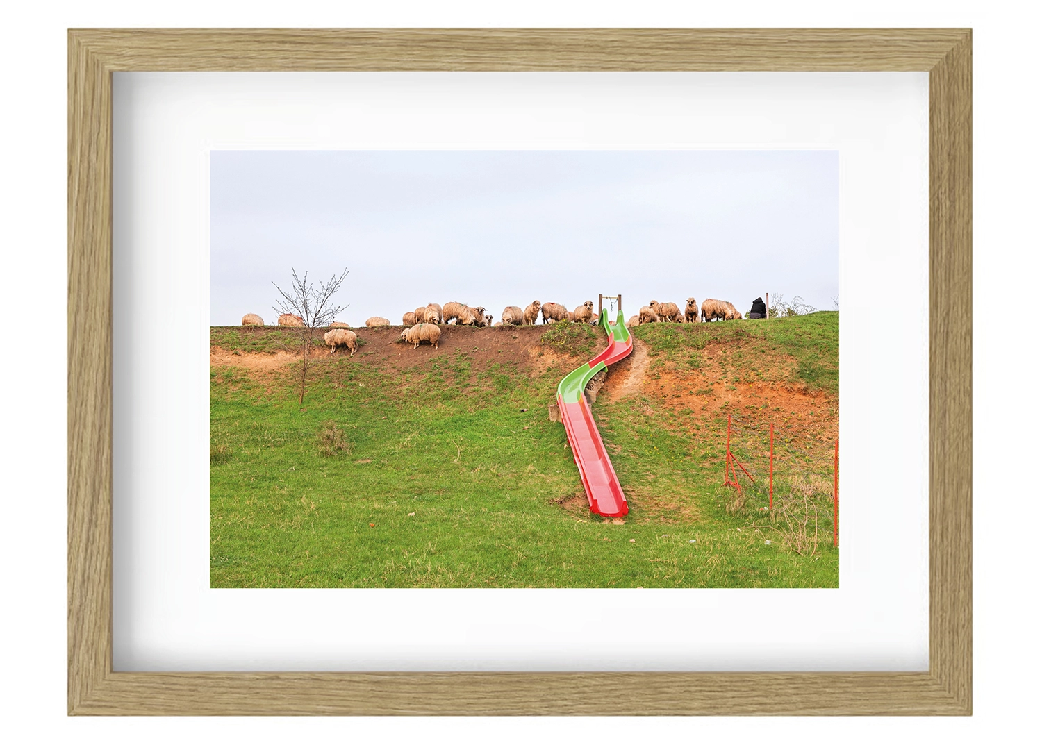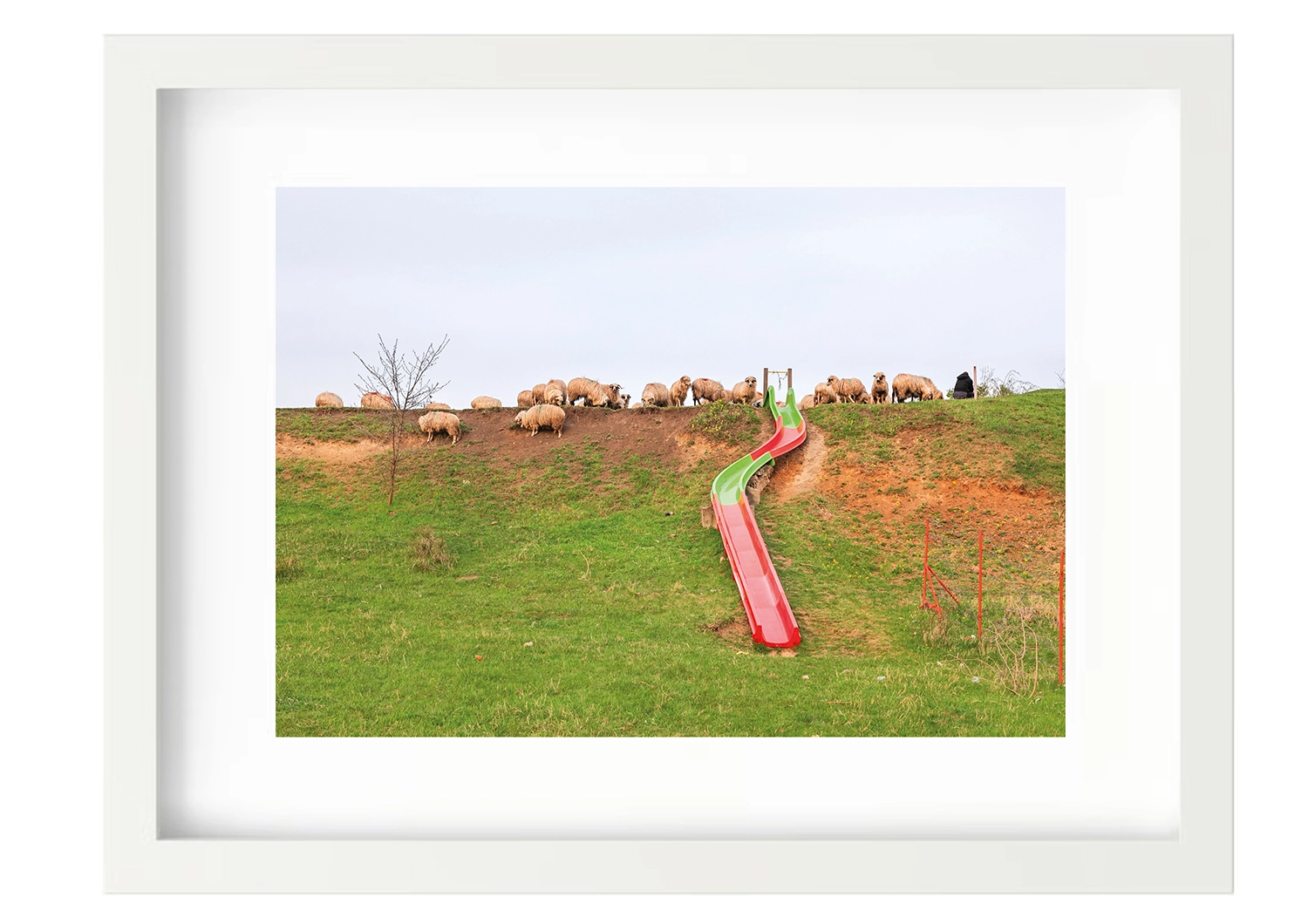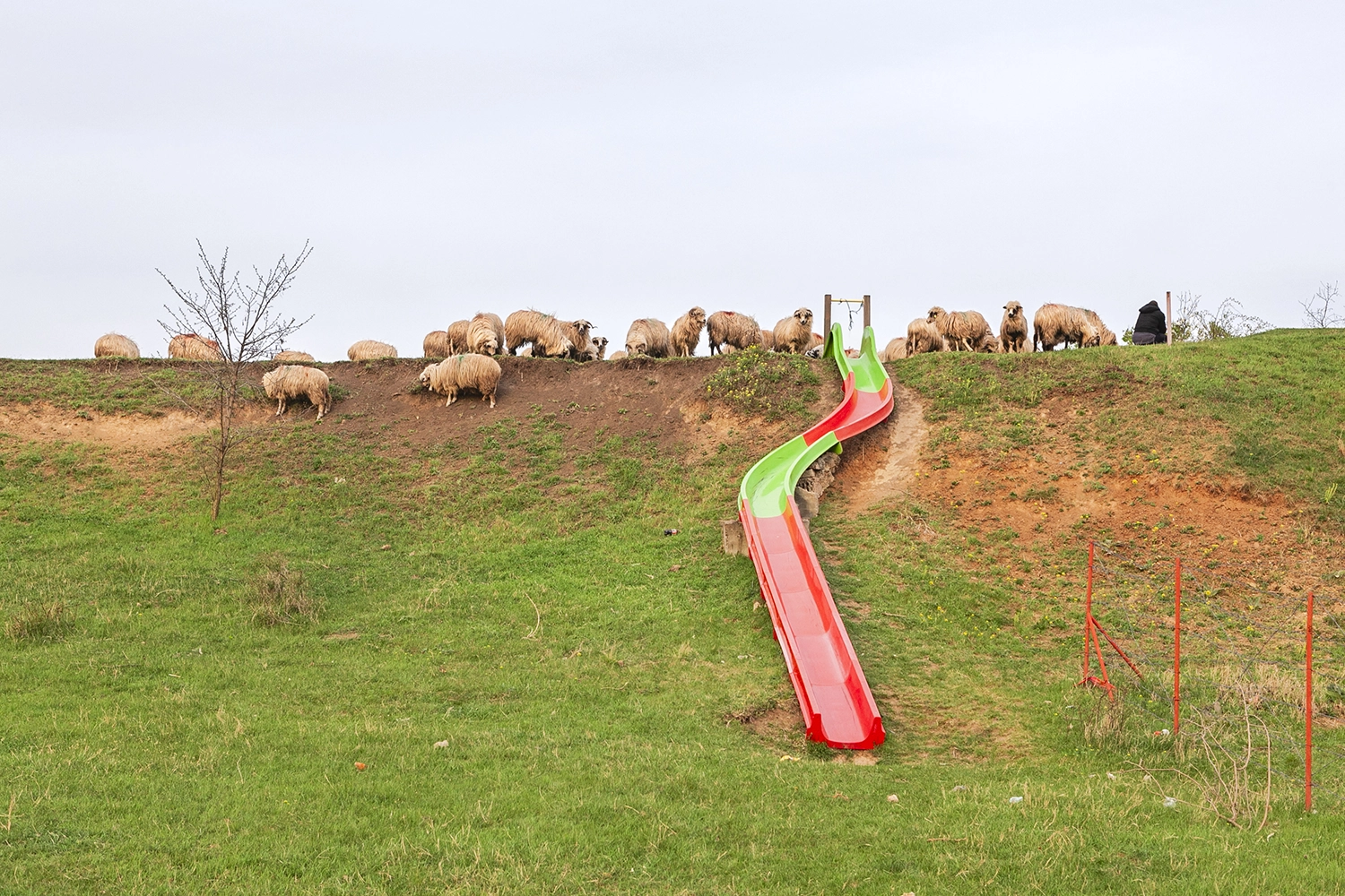 Ovejas pastando al lado de un tobogán, en la pequeña población de Mănăștur, ubicada en la región de Arad, en Rumanía. Esta imagen es parte del proyecto “Un día brillante”, en el que de forma documental se cuenta la vuelta a casa del padre del padre emigrante, que después de meses, se reencuentra físicamente con sus familiares y allegados. Las pocas posibilidades de crecimiento profesional que ofrece el mundo rural en muchas poblaciones de Rumanía, ha obligado durante años a que parte de su población emigre a países de la Unión Europea y Reino Unido, como destinos principales.